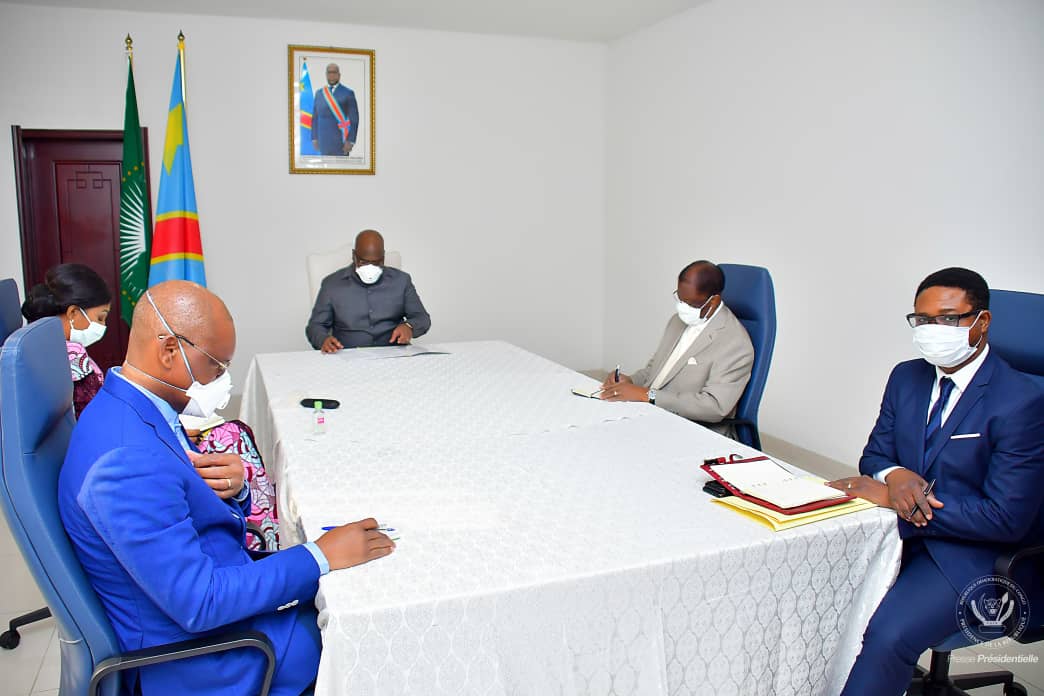 Le Président de la République Démocratique du Congo son exéllence Félix Tshisekedi Tshilombo préside à la Nsele à une réunion à laquelle il a réuni les deux chambres du parlément, Mme Jeanine Mabunda et Alexis Tambwe Mwamba, ainsi que son directeur de cabinet adjoint et le conseil spécial de sécurité. La pandémie de coronavirus n'a pas empêchée la tenue de cette réunion, ils ont été obligé de porter les masques au cours de la réunion.